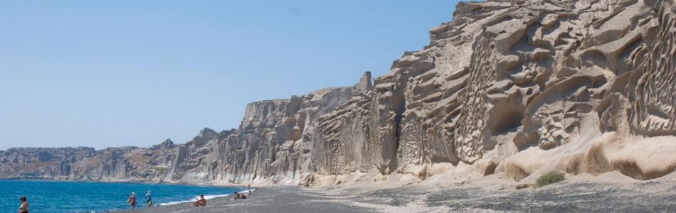 Πλησιάζοντας στη Βλυχάδα θα σας κάνουν εντύπωση τα ψηλά φουγάρα του εργοστασίου τοματοποιίας Νομικού. Οι μικρές αυτές βιομηχανίες, μαζί με άλλες (πλεκτήρια, οινοποιεία κ.α.) αναπτύχθηκαν στο νησί τις τελευταίες δεκαετίες του 19ου αιώνα και τις πρώτες του 20ου. Tο θέαμα που δημιουργούν τα ψηλά, λευκά ηφαιστειακά βράχια της παραλίας που μοιάζει απέραντη, είναι εντυπωσιακό. Είναι δημιουργήματα της φύσης και έχουν σμιλευτεί στη διάρκεια των αιώνων από τη βροχή και τον αέρα.